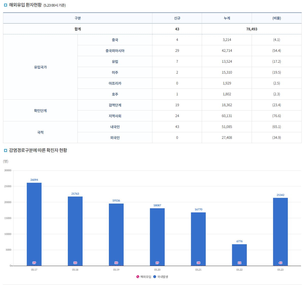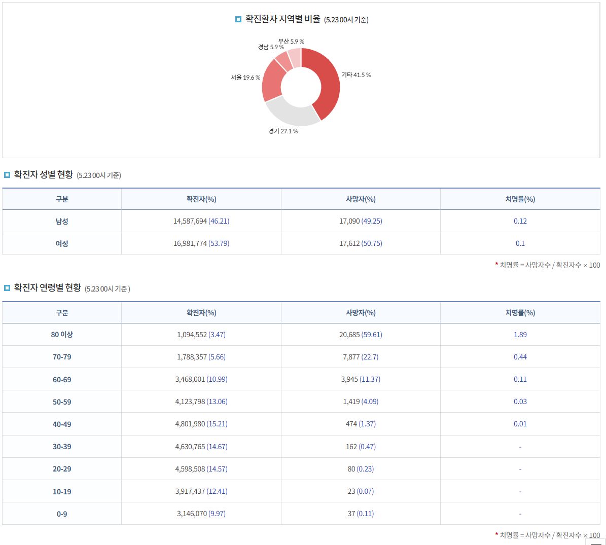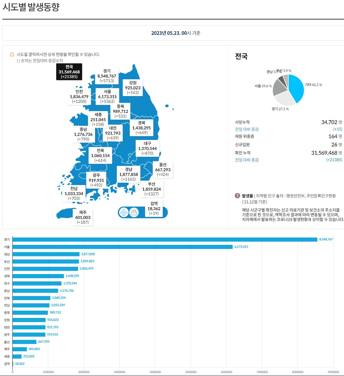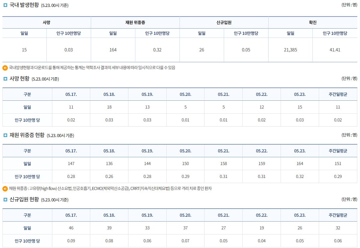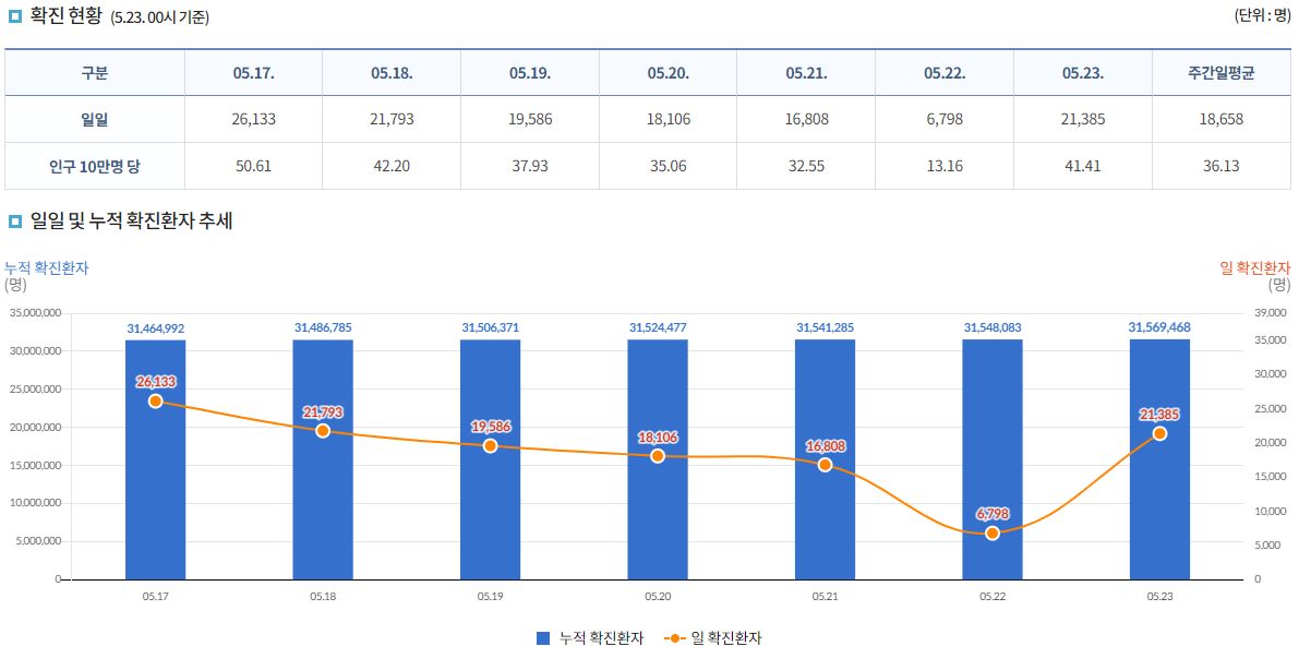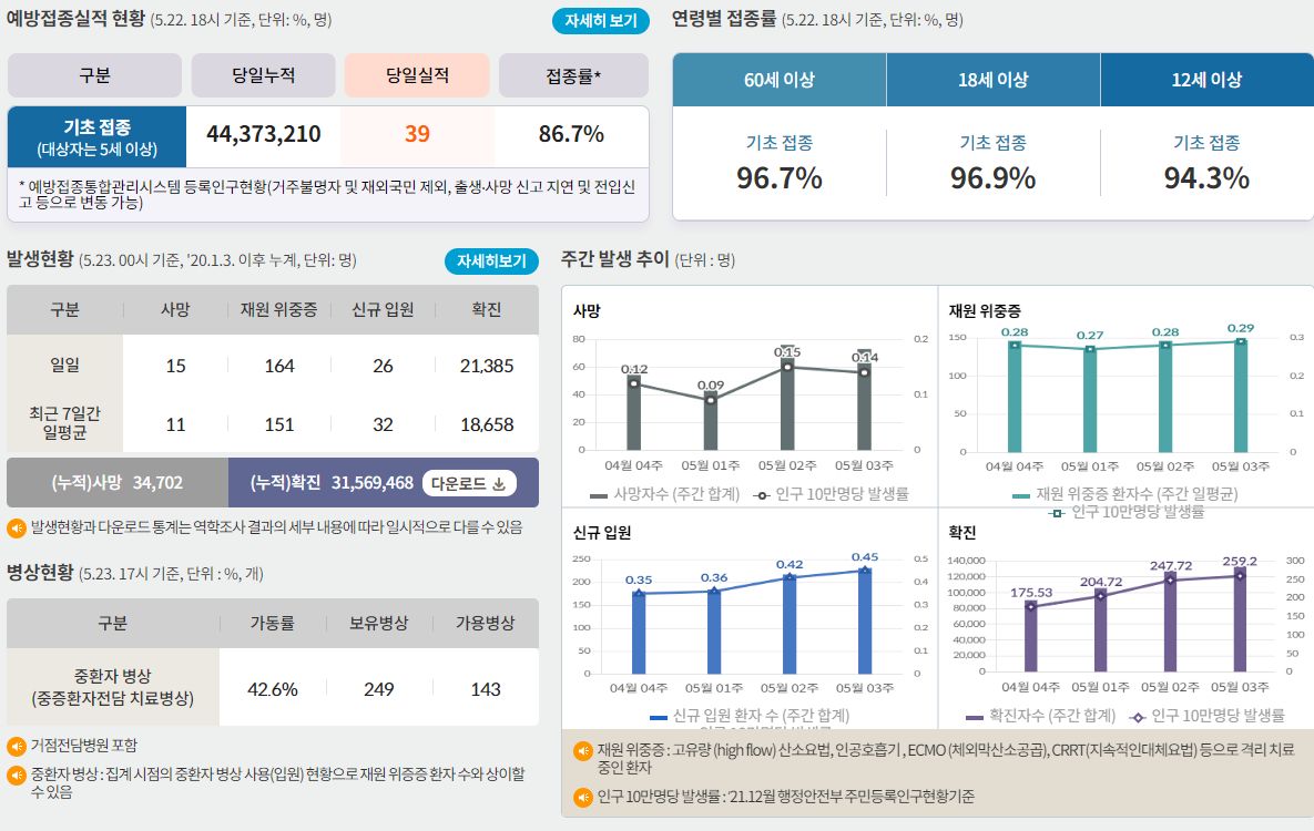코로나19집계(2023.5.23.) 확진 +2.1만, 사망 +15명, 중환자병상가동률 43% 본문