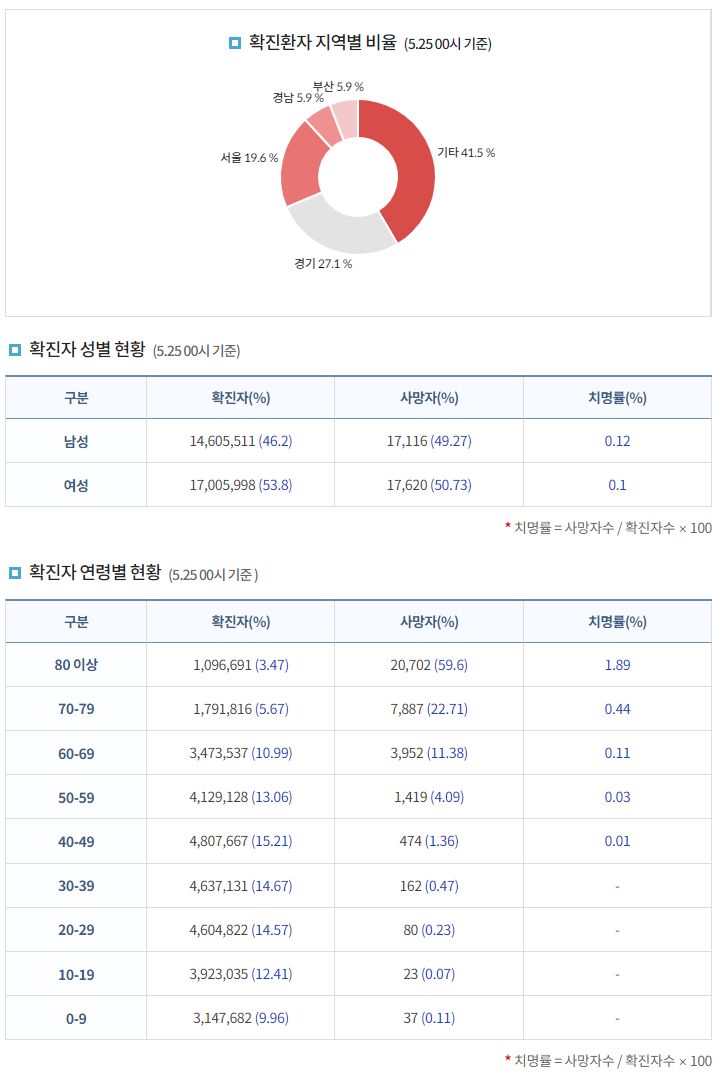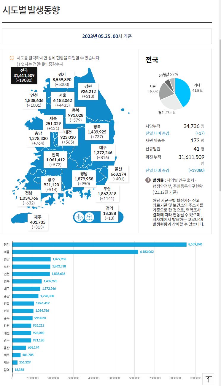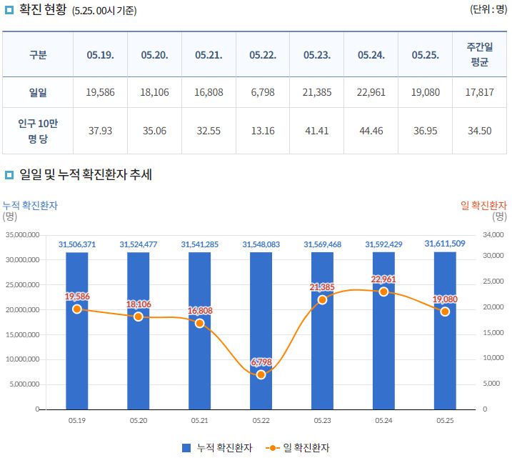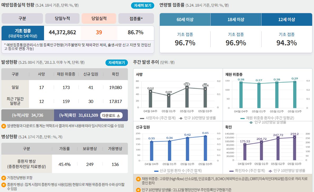 코로나19집계(2023.5.25) 확진 +1.9만, 사망 +17명, 중환자병상가동률 45% 본문