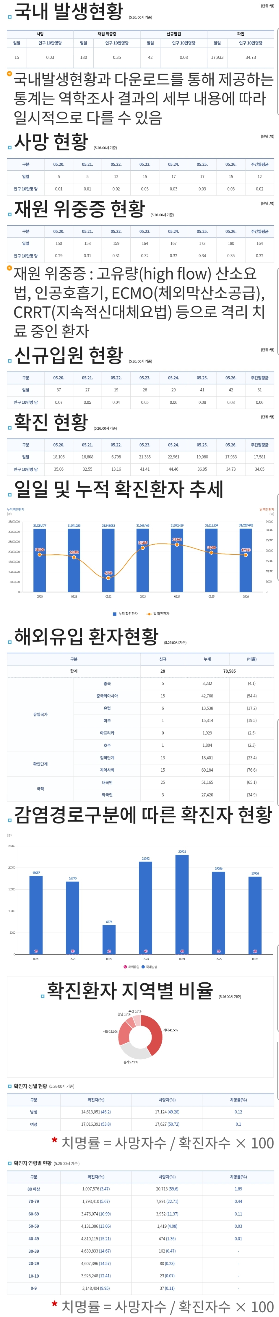 코로나19집계(2023.5.26. 0시기준) 확진 +1.8만, 사망 +15명, 중환자병상가동률 44% 본문