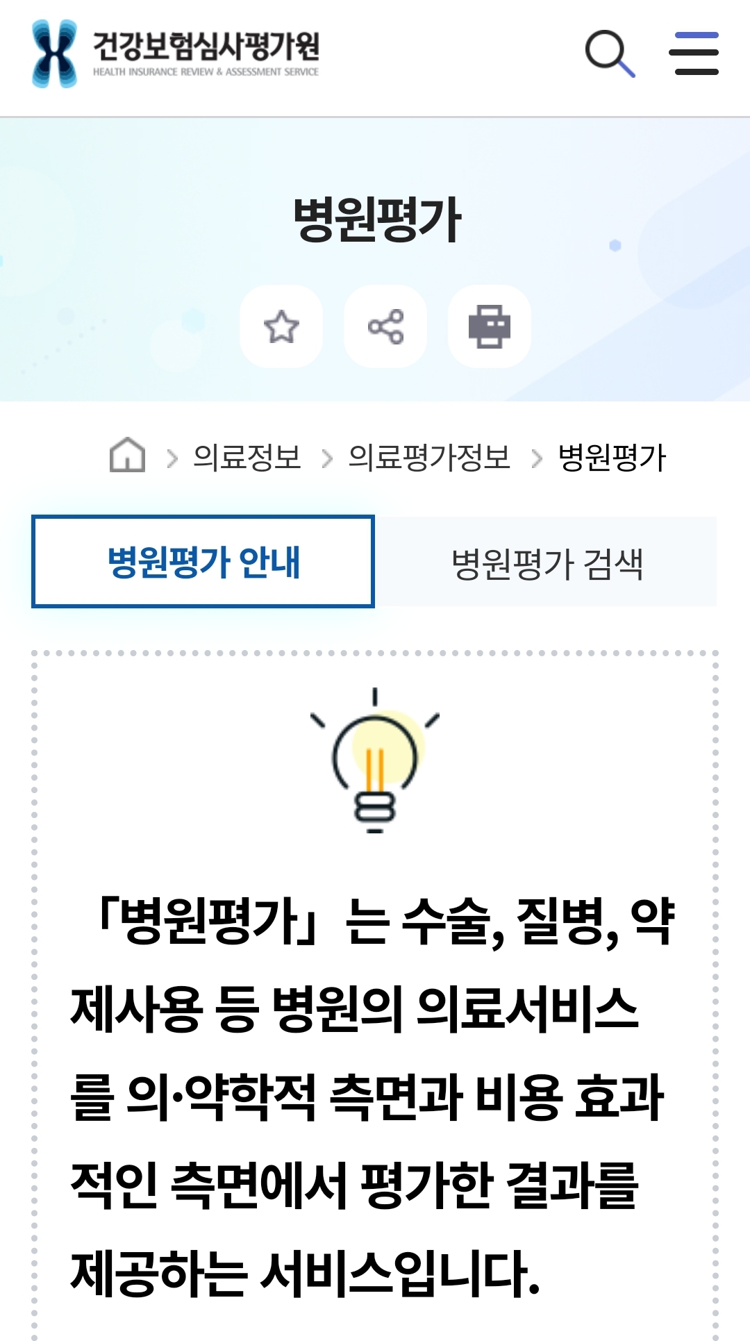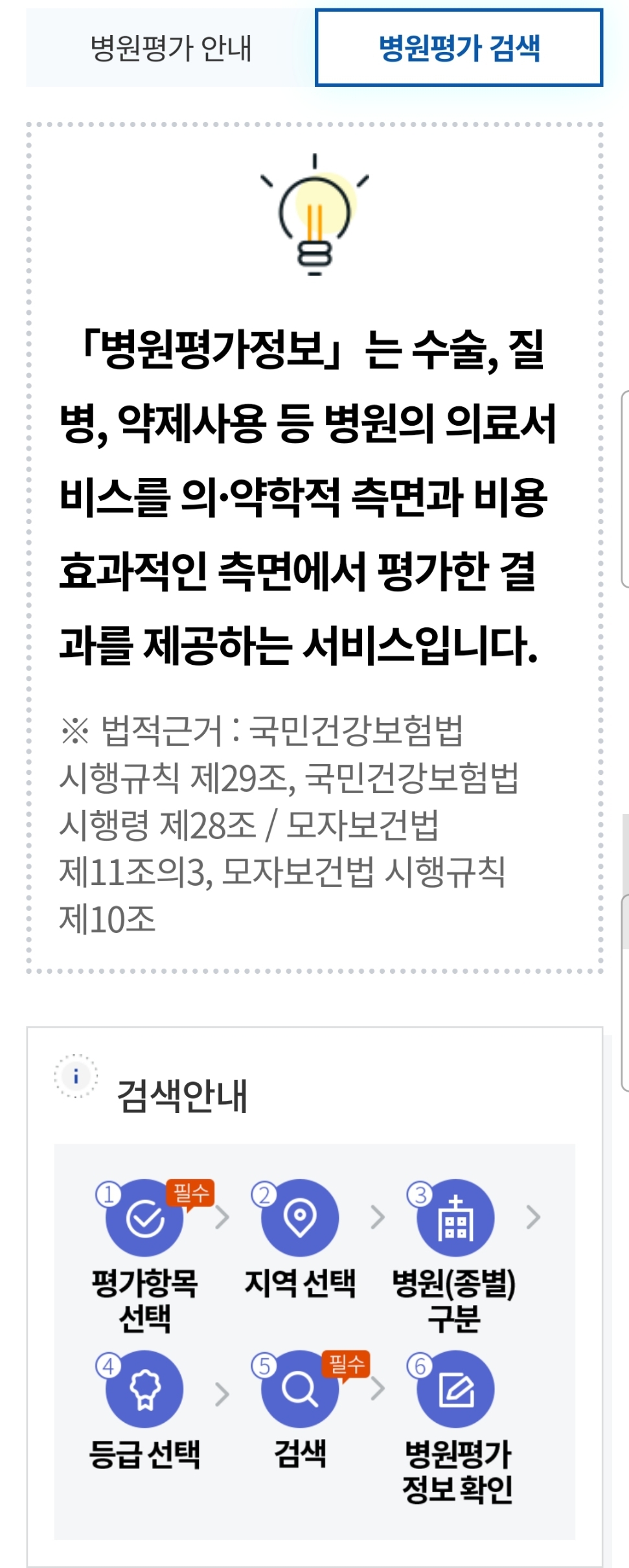「병원평가」는 수술, 질병, 약제사용 등 병원의 의료서비스를 의·약학적 측면과 비용 효과적인 측면에서 평가한 결과를 제공하는 서비스입니다. ※ 법적근거 : 국민건강보험법 시행규칙 제29