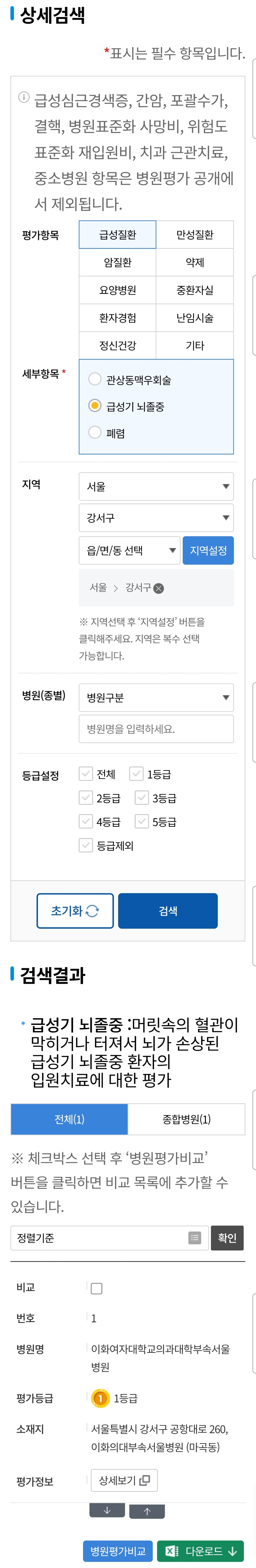 시험삼아 서울 강서구를 지역으로 잡고 급성기 뇌졸중으로 검색하면,