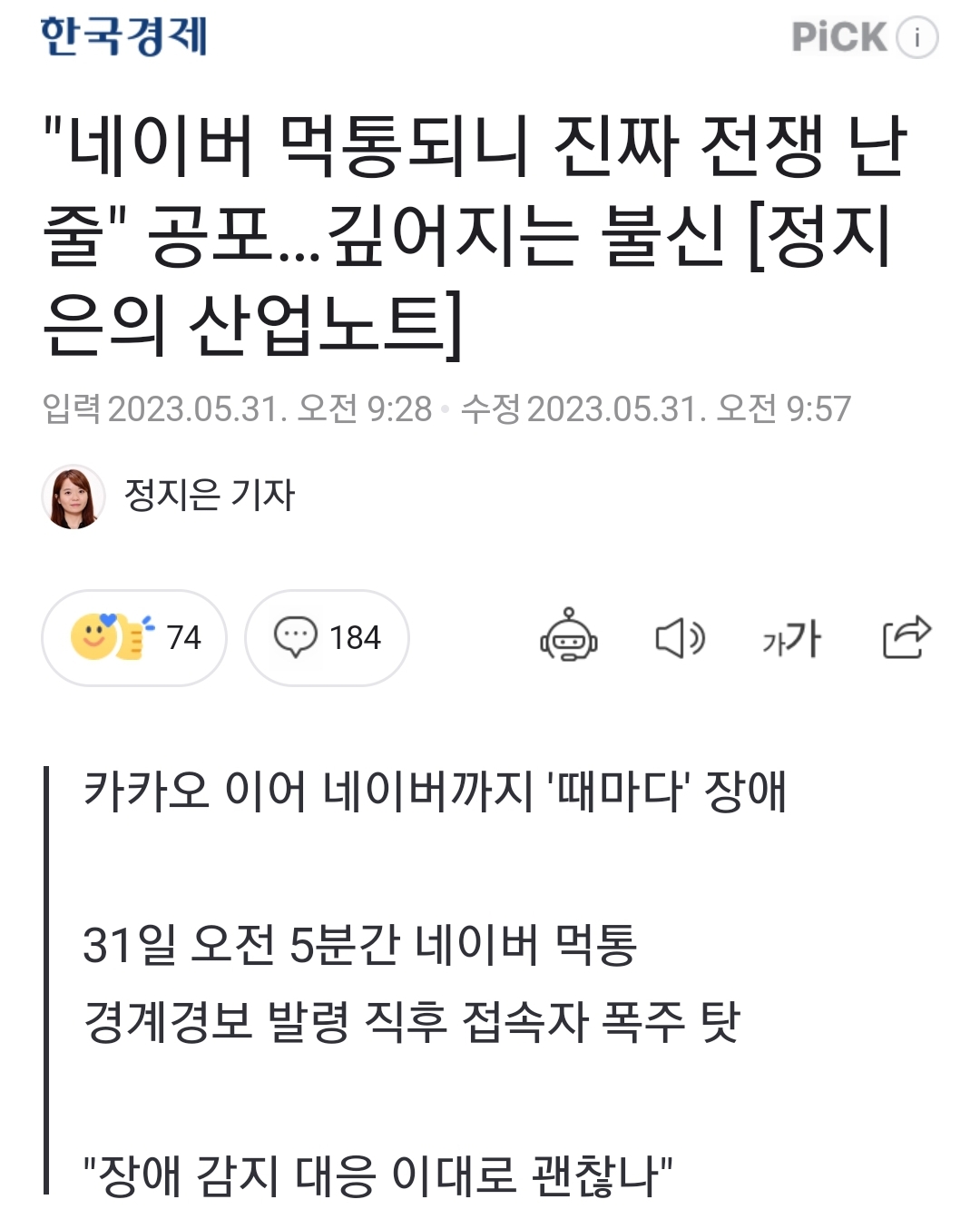 "네이버 먹통되니 진짜 전쟁 난 줄" 공포…깊어지는 불신 [정지은의 산업노트]