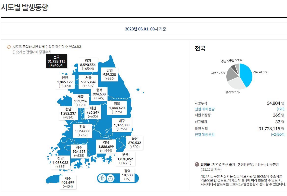 ★코로나19집계(2023.6.1.) 확진 +2.5만, 사망 +20명, 중환자병상가동률 39%/:/ 오늘부터 자가격리의무가 아닌 날. 본문