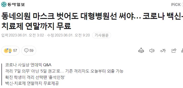 (2023.5.31.) 코로나19 위기단계 하향 및 주요 방역조치 전환 (질병관리청 보도자료) (0) | 2023.06.01 |