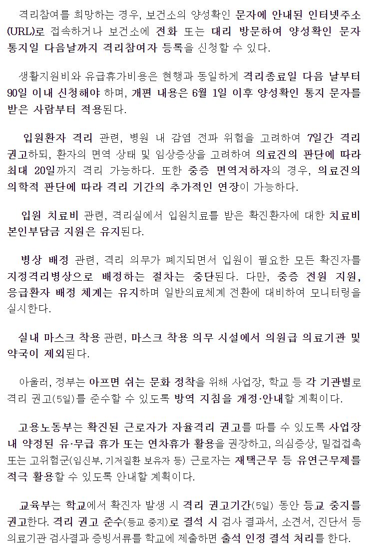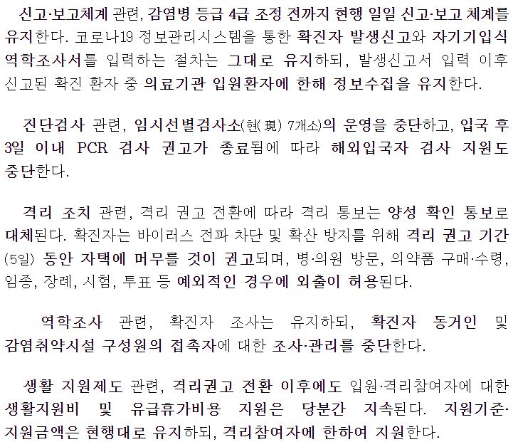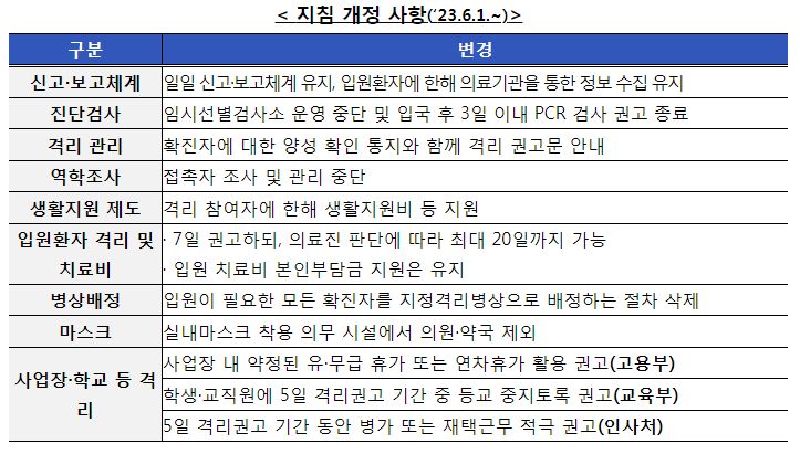 ○ 격리(7일 의무→5일 권고), 마스크(의원급·약국 권고) 등 주요 방역조치는 완화하되, 생활지원제도 및 치료비 지원 등 국민 지원체계는 유지