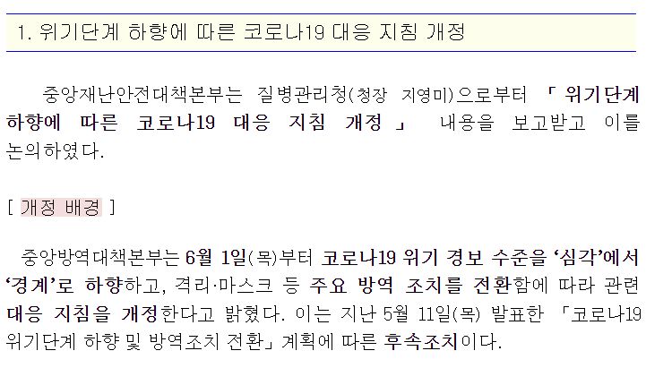 [5.31.수.정례브리핑 보도자료] 코로나19 위기단계 하향 및 주요 방역조치 전환
