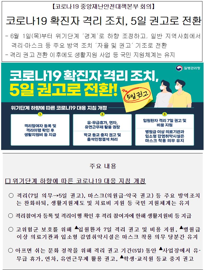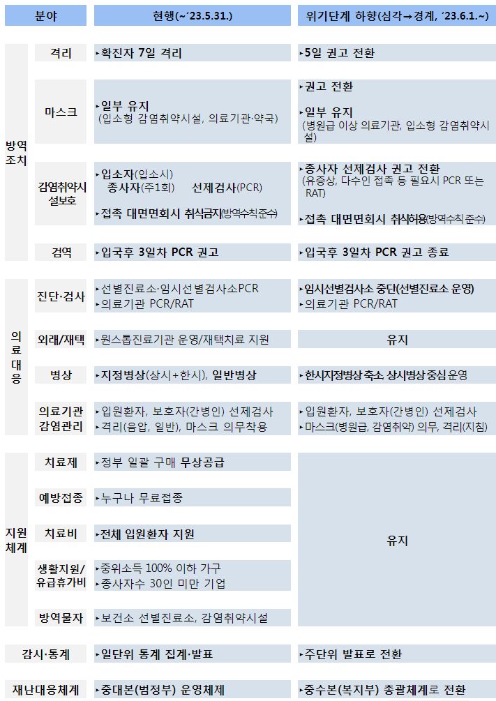 - 6월 1일(목)부터 위기단계 ‘경계’로 하향 조정하고, 일반 지역사회에서 격리·마스크 등 주요 방역 조치 ‘자율 및 권고’ 기조로 전환