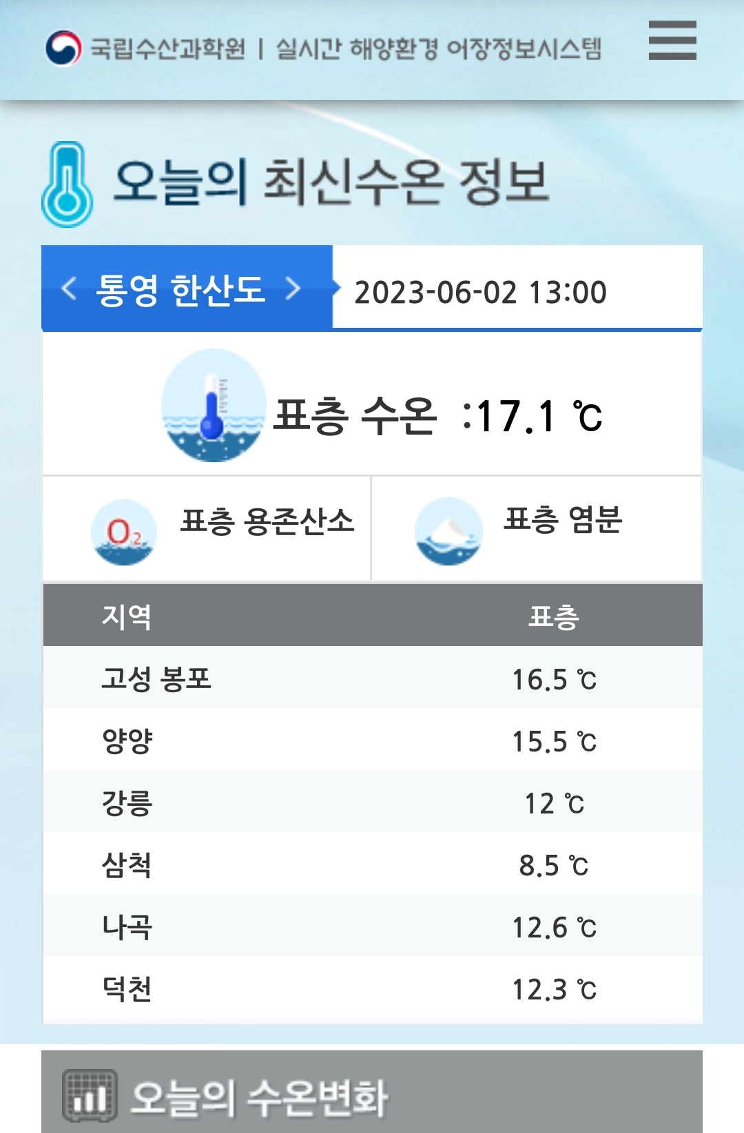 국립수산과학원은 연안 실시간 수온 게시 중.
