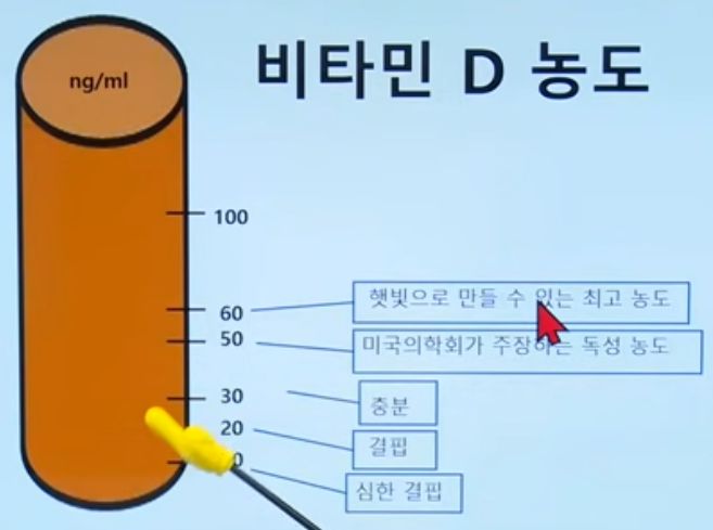 ㅡ 혈중 농도는 햇볕으로 만들 수 있는 최고치가 60 정도다. 자연적으로 만들 수 있는 50~60 을 넘기지 않도록 해야 한다. 반대로 20미만은 안 좋으니 먹고. 하여튼 정상범위의 중간인 40쯤 되면 비타민D는 먹지 마라.