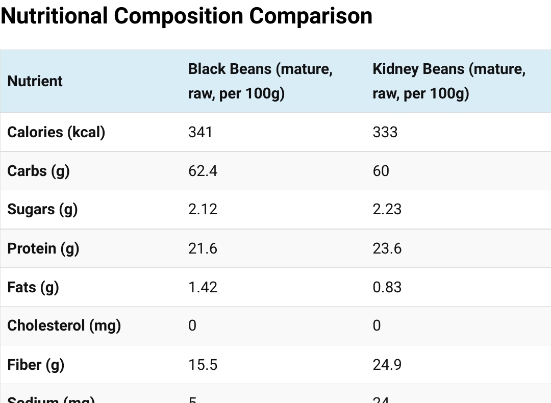 "This table contains the nutritional values for black beans and kidney beans. The data are from the USDA website (3, 4). All nutrients are given as amounts per 100 g." ( https://medmunch.com/black-beans-vs-kidney-beans/ )