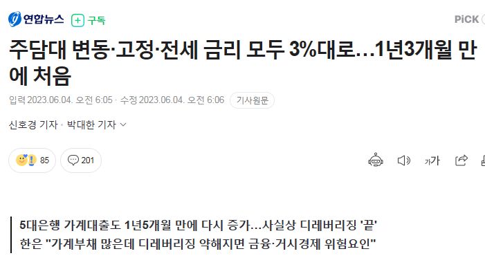 ㅡ 2023.6.4. 기준, KB국민·신한·하나·우리은행의 2일 기준 주택담보대출 변동금리(신규 취급액 코픽스 연동)는 연 3.910∼6.987% 수준