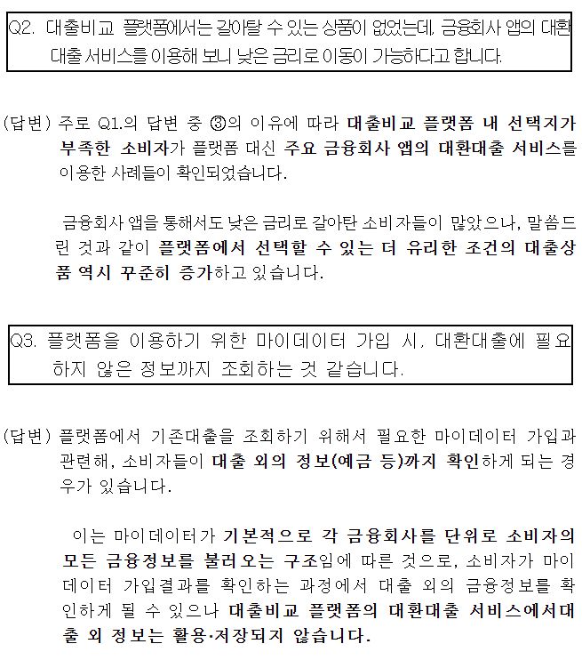 ㅡ 현재 네이버페이, 뱅크샐러드, 카카오페이 등 핀테크 플랫폼과 웰컴저축은행, KB국민카드 등 금융사 플랫폼이 대환대출 서비스를 제공하는데 플랫폼별로 제휴를 맺은 금융사가 달라 2개 이상의 플랫폼을 이용하는 경우 새로운 플랫폼에서 마이데이터 불러오기를 해야 한다.
