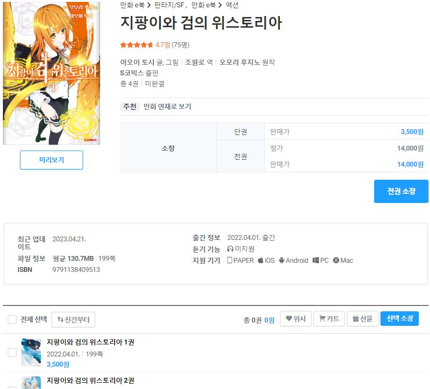 리디북스에서 1화씩 나눈 대여본과 소장본, 그리고 단행본 소장본 전자책으로 결제할 수 있습니다.