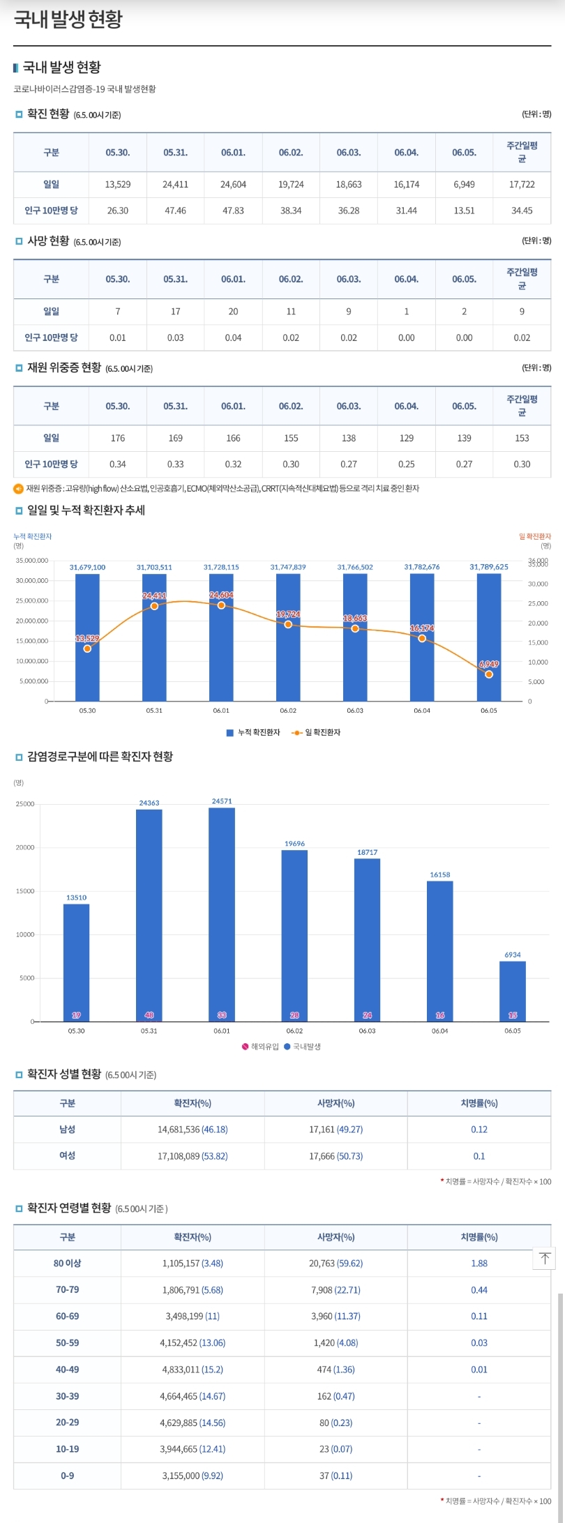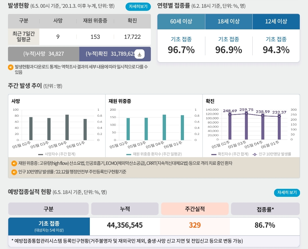 코로나19집계(2023.6.5.) 확진 +1.8만, 사망 +9명, 재원위중증 153명 본문