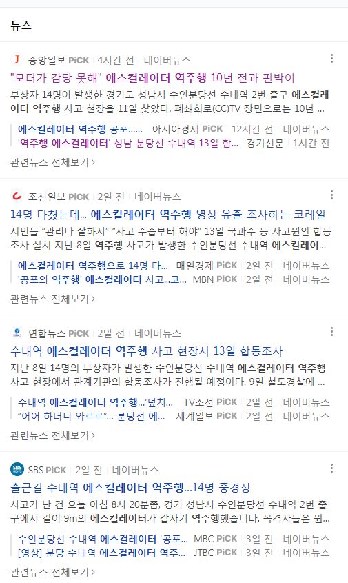 수인분당선 수내역 에스컬레이터 역주행 사고 기사 몇 가지 본문