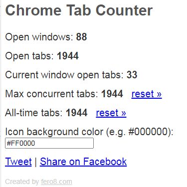 Shows a counter of open tabs in the extensions bar. Also records the number of opened windows and all-time opened tabs.