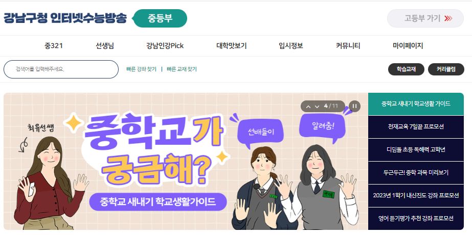 ★ 중등부과정도 따로 있습니다. 배너를 보니, 초등학교 6학년이 봐도 될 중학교생활 가이드도 있는 것 같네요. ^^