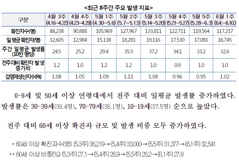 코로나19 주간 발생 동향 및 주간 위험도 평가(6.4.∼6.10.): 감염재생산지수(Rt=1.02)