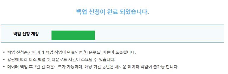 따로 백업완료알림을 보내준다는 말은 없으니까, 백업신청하고 3~5일 정도 뒤에 다시 로그인하면 다운로드버튼이 생겨있을 것 같네요.