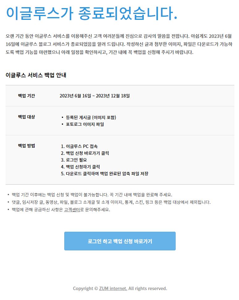 이글루스 서비스 백업 안내