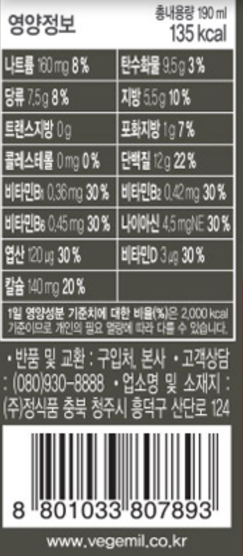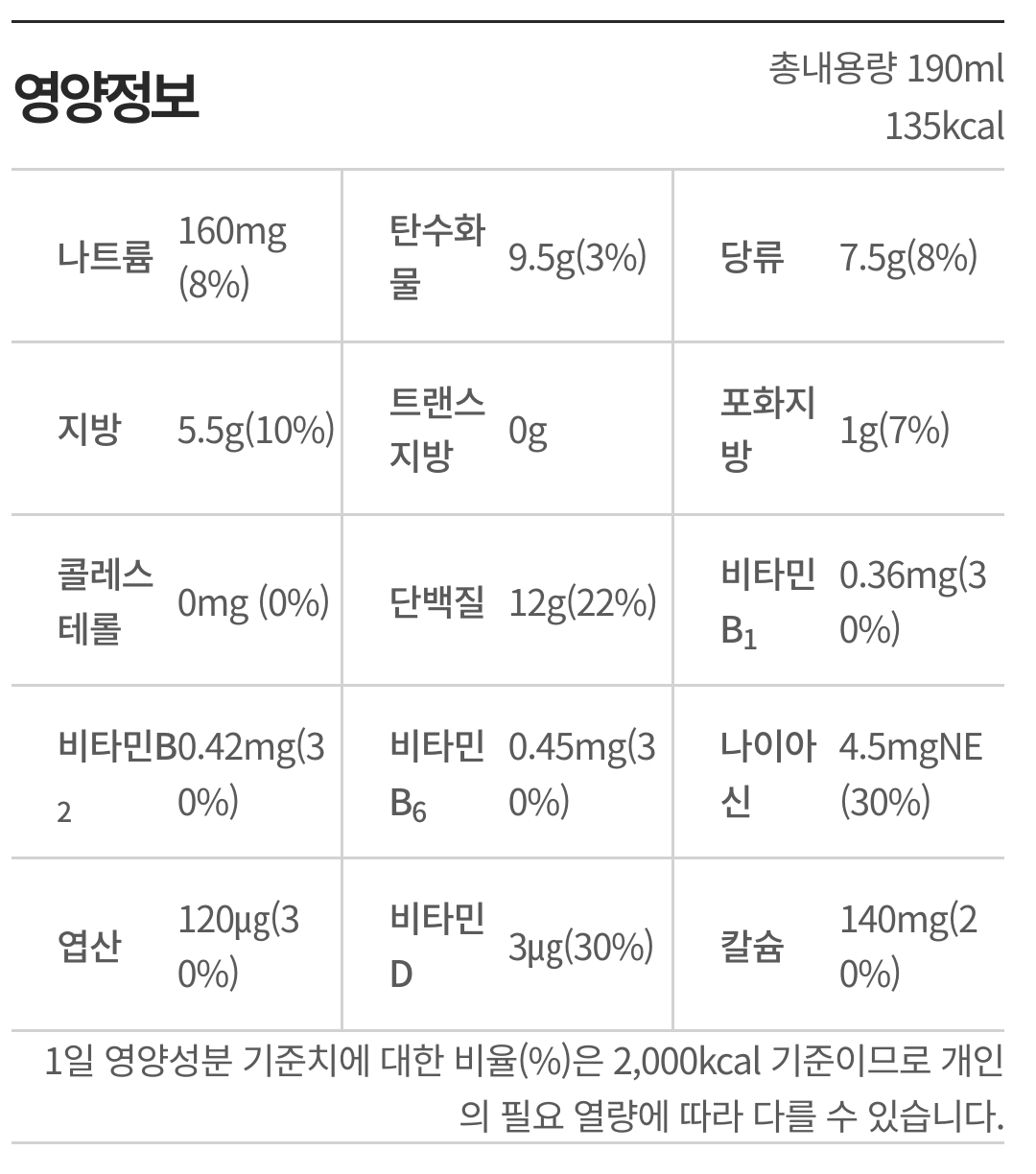 완전영양식이 아니라 두유인 만큼, 뉴케어 하이프로틴보다는 훨씬 먹기 편했다. 물론 뉴케어는 200ml에 200kcal이던가 그럴 것이고 이 녀석은 190ml에 135kcal이면서 영양조성도 단순하니 맛이 있을 수밖에.4