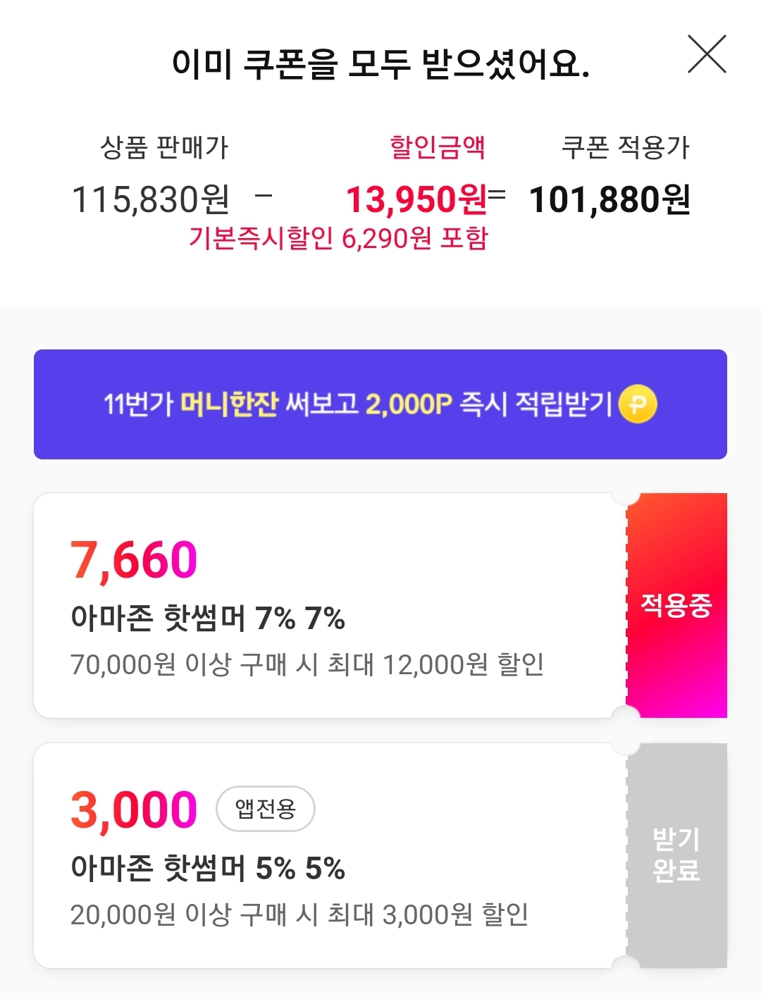 할인은 상품페이지 가격 옆에 있는 쿠폰다운로드 링크로 일단 받고 결제화먼에서 적용. 우주패스회원은 추가 장바구니쿠폰이 있을 수 있습니다.