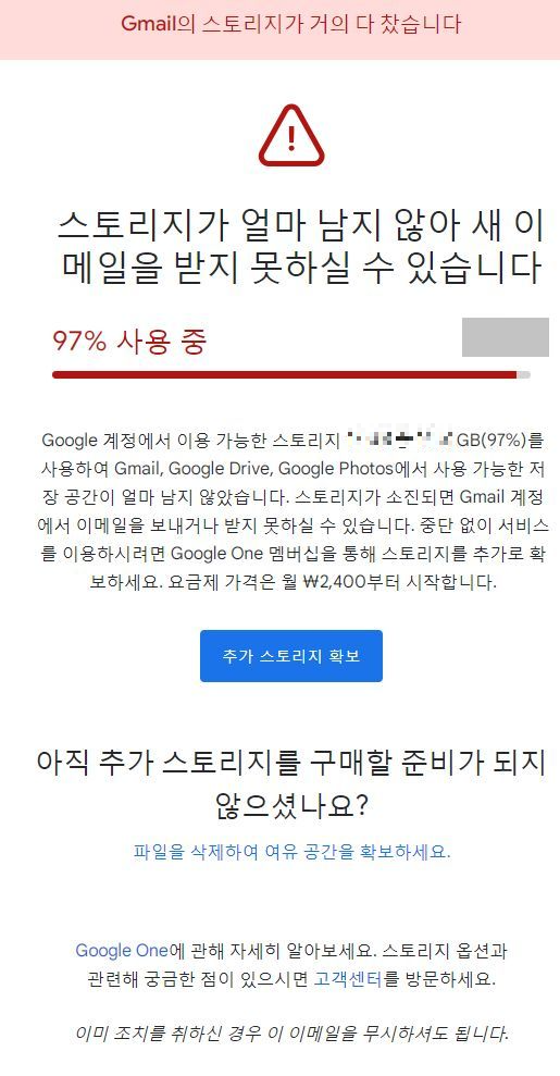 구글 스토리지(구글드라이브) 다 썼을 때 알림메일 본문