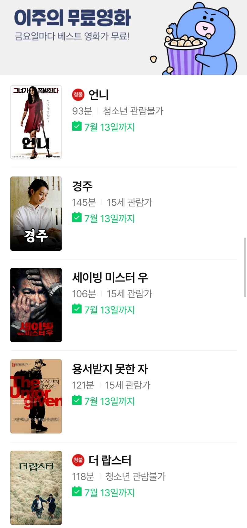 | (네이버시리즈온 무료영화) 파이어스톰, 나의 천사, 새터데이 픽션, 증오, 컴백 트레일(~7.6까지) (추가) (0) | 2023.07.05 |