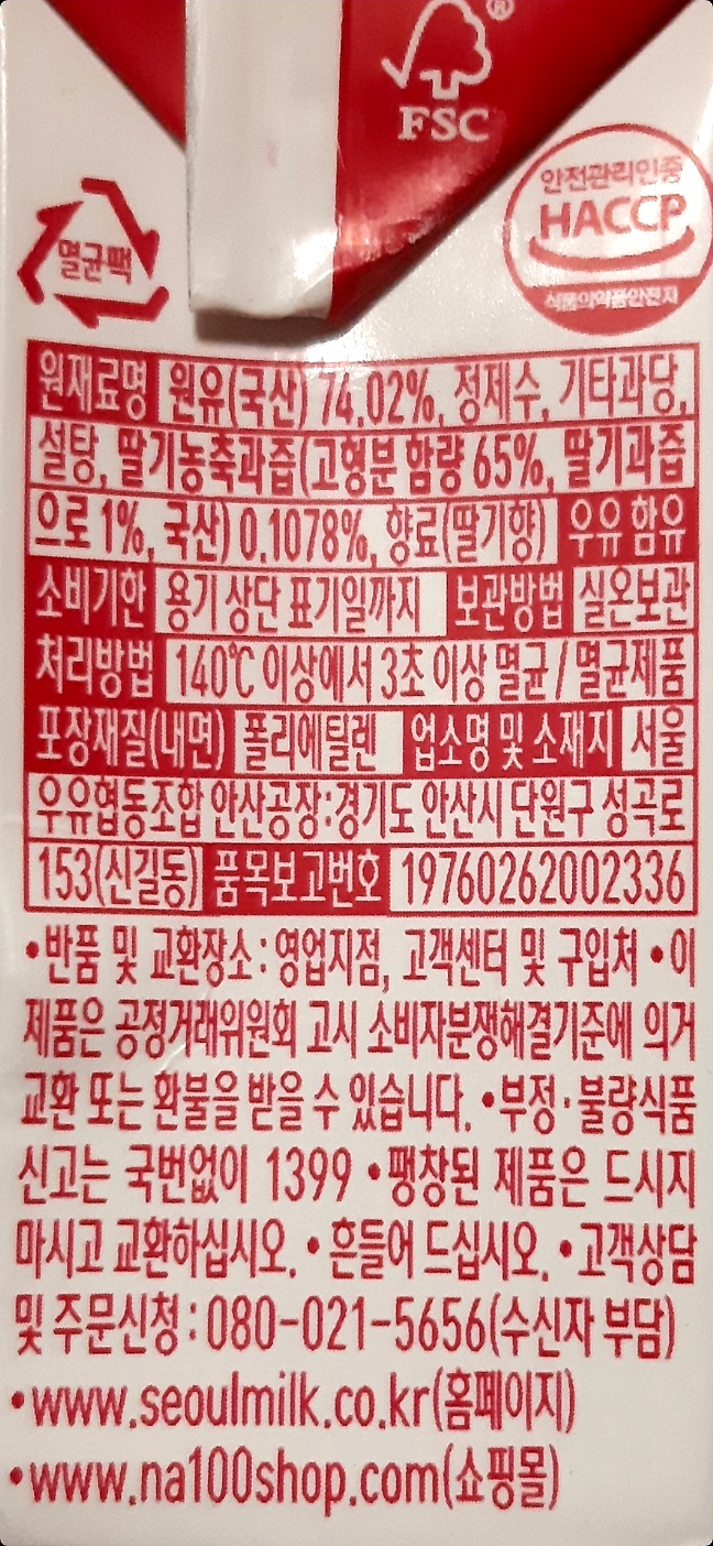 주성분은 원유, 정제수, 기타과당, 설탕, 딸기농축과즙, 향료