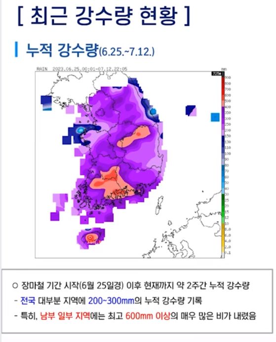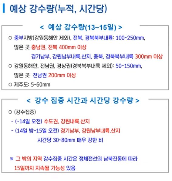 o 예상 강수량(현재~15일까지): 100~250mm(많은 곳 400mm 이상)