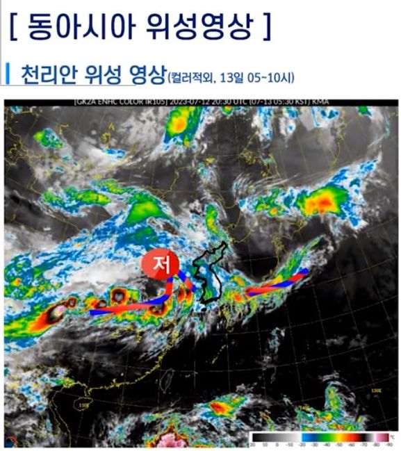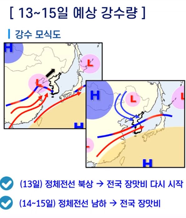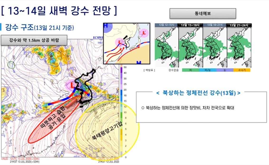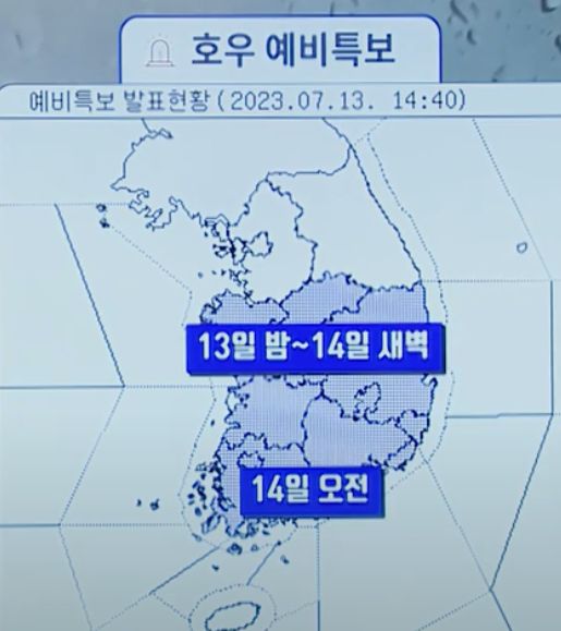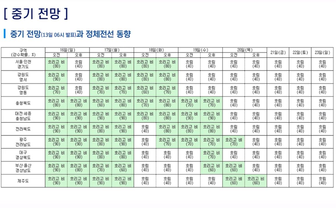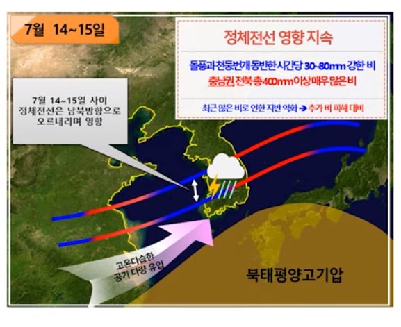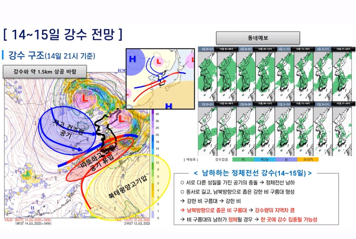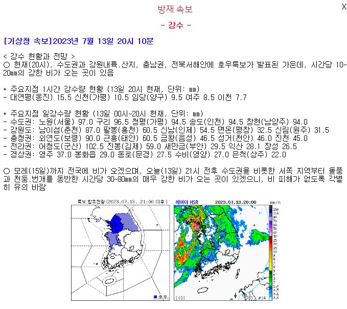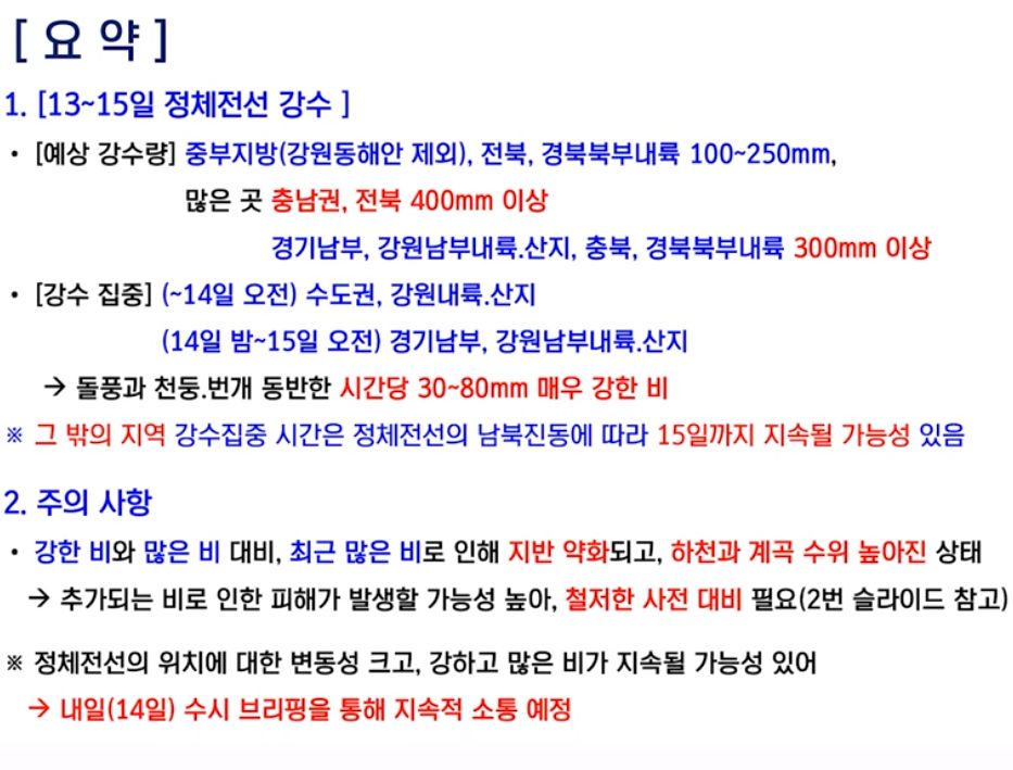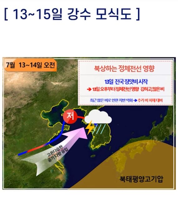 - 오늘(13일)부터 모레(15일) 사이 저기압과 정체전선의 영향으로 매우 많은 비가 내리겠으며, 좁은 지역에 매우 강한 비가 내리면서 지역에 따라 강수 강도와 강수량의 차이가 크겠고, 강약을 반복하면서 소강상태를 보이는 곳이 많겠으니, 최신 기상정보와 레이더 영상을 참고하기 바랍니다.