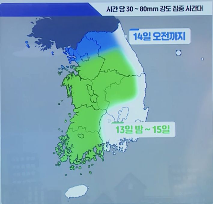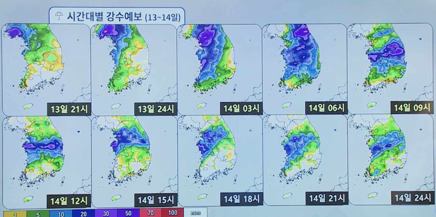 13일 밤부터, 서해연안지역부터 시작해 시간당 30~80mm의 매우 강하 비가 오는 곳이 있을 수 있음.