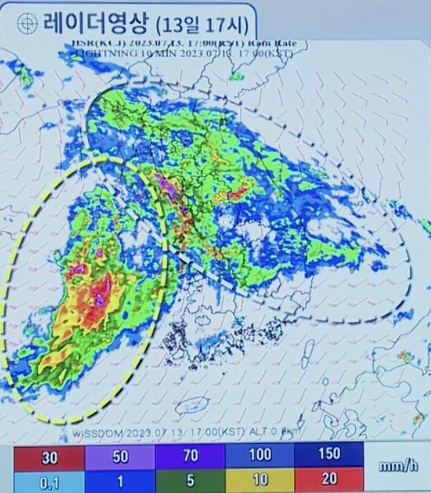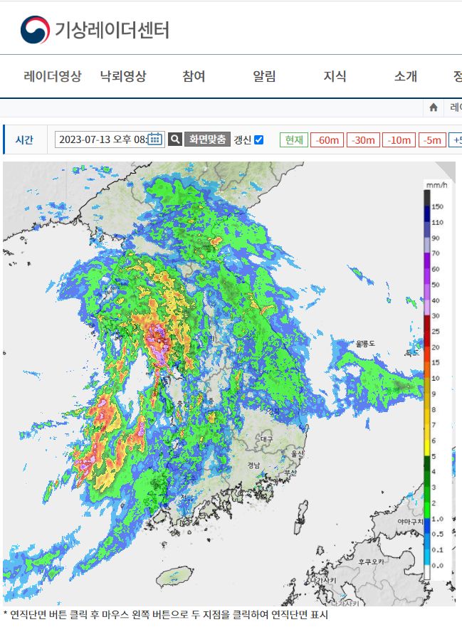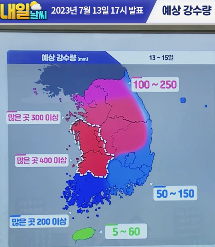 일기예보, 모레(2023.7.15)까지, 지역별 편차가 있지만 시간당 30~80mm, 주말 충남전북 400mm이상/:/ 기상청 링크 본문