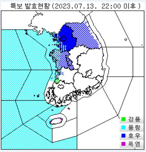 o 호우주의보 : 서해5도, 강원도(태백, 영월, 평창평지, 정선평지, 횡성, 원주, 철원, 화천, 홍천평지, 춘천, 양구평지, 인제평지, 강원북부산지, 강원중부산지, 강원남부산지), 충청남도, 전라북도(부안, 군산, 김제), 대전, 세종