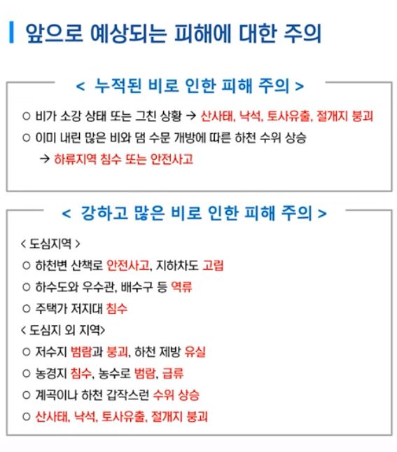 - 이미 내린 많은 비로 인한 하천 수위 상승과 댐 수문 개방으로 인한 하천 하류지역 침수 또는 안전사고 유의