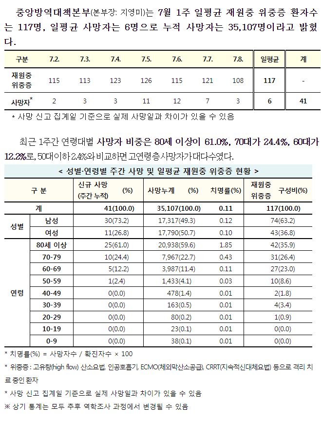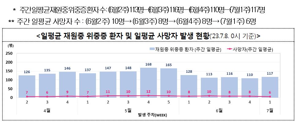 "지난주 재원중 위중증 환자수는 전주 대비 6.4% 증가하여 일평균 117명이고, 신규 사망자 수는 전주 대비 29.3% 감소(58명→41명)하였고 일평균은 6명이다."