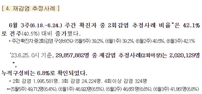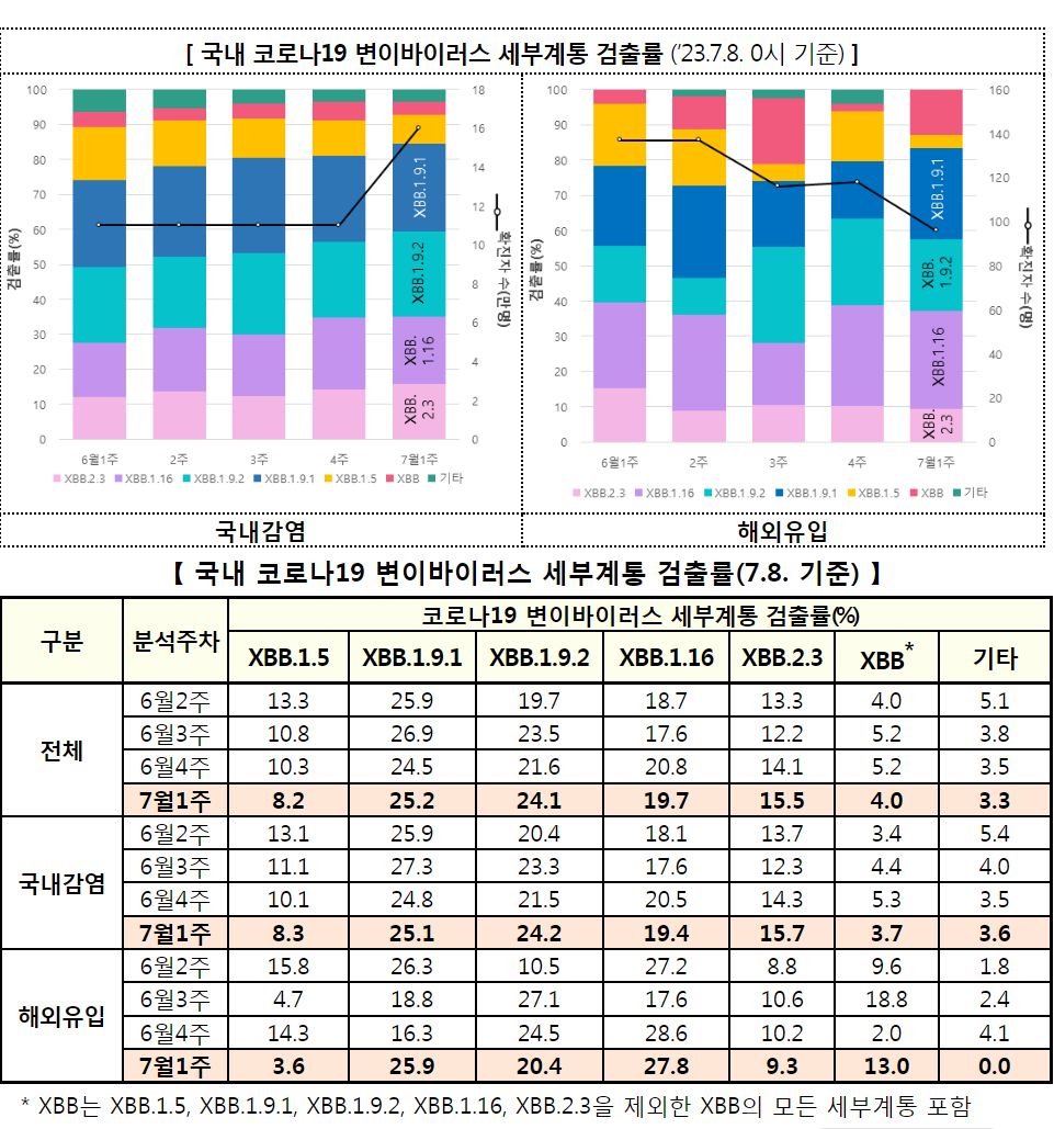 "XBB.1.9.1의 검출률은 25.2%(+0.7%p)로 최근 7주간 20%대 중반 유지, XBB.1.9.2와 XBB.2.3은 24.1%(+2.5%p)과 15.5%(+1.4%p)로 지속 증가추세이다."