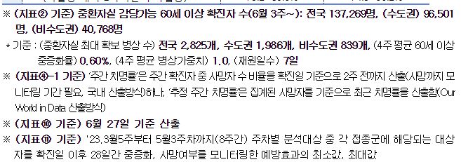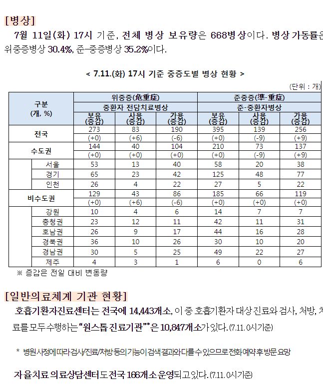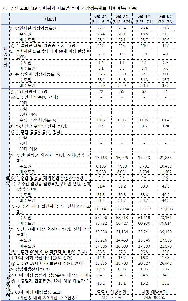 * 중환자 병상가동률(6.4주 → 7.1주): (전국) 23.4% → 21.2%, (수도권) 18.8% → 21.5%, (비수도권) 28.7% → 20.9%