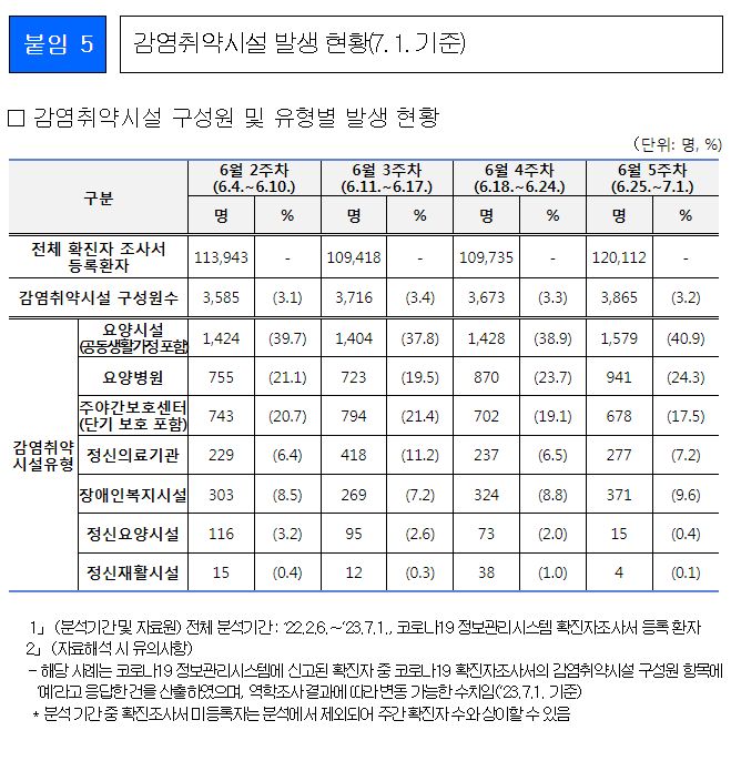 "6월 5주 전체 확진자 중 감염취약시설 구성원 수는 전주 대비 증가(3,673명 → 3,865명) 하였으며, 비율은 감소(3.3% → 3.2%)하였다"