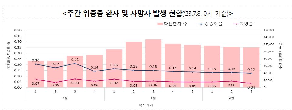 "6월 3주차 확진자를 2주간 모니터링한 결과, 중증화율 0.12%, 치명률은 0.04%이었다."