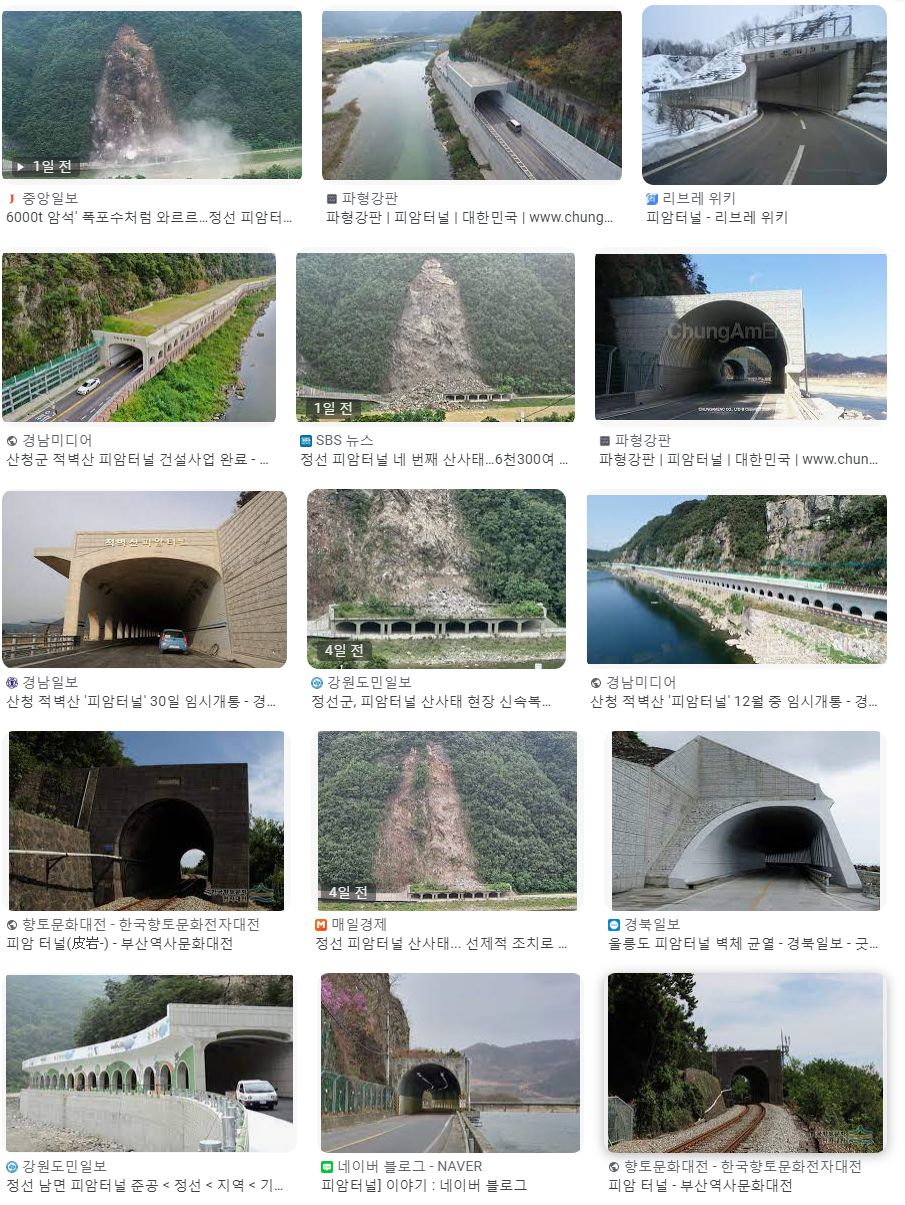 "피암터널"이란, 낙석위험이 있지만 옹벽을 설치해 막기 어려운 도로를 구조물로 덮어 터널처럼 만든 것이라고 합니다. 암석을 피하는 용도로 만든 터널이니까 피암터널이라는 듯.