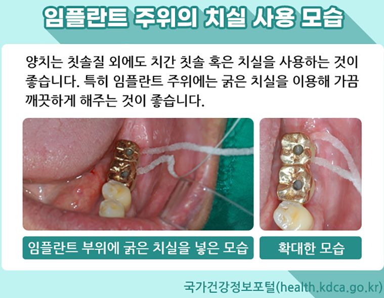 칫솔질을 잘 하고 있다면, 칫솔은 3달 정도면 바꿔주는 것이 좋다. 그리고 치간칫솔이나 치실로 마무리해주는 것이 좋다. 임플란트를 했다면 수압으로 청소하는 종류도 괜찮다.