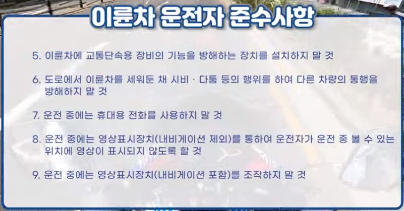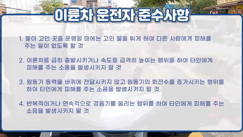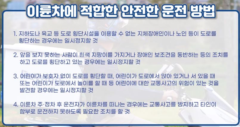 ㅡ 슬리퍼 착용 금지. 주행 중 발내리지 말기.