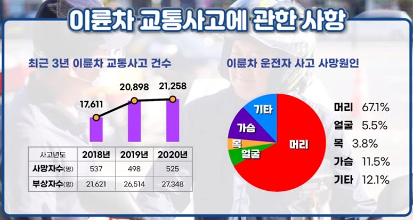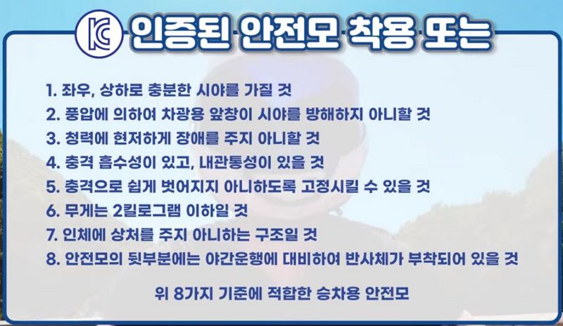 ㅡ 반드시 KC인증 안전모를 제대로 된 착용법으로 쓰기. 이륜차사고 대부분은 머리사고를 동반.