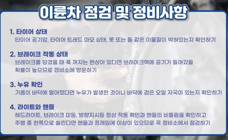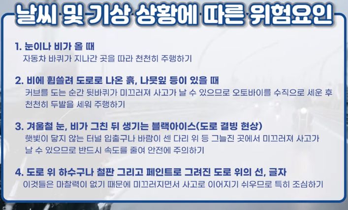 ㅡ 오토바이는 차마다 제동거리가 다르다. 자기 차 성질을 평소 확인하고 숙지하기.