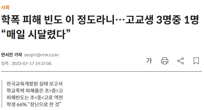 학폭 피해 빈도 이 정도라니…고교생 3명중 1명 “매일 시달렸다” - 매일경제