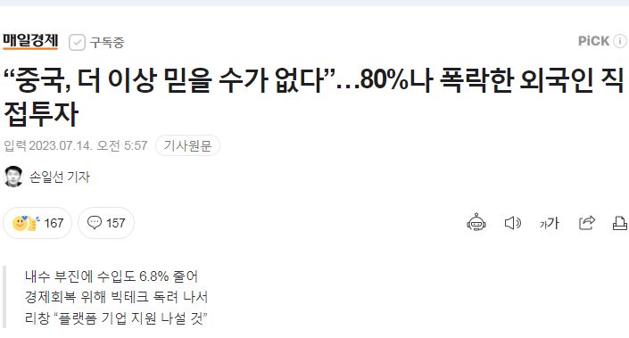 ㅡ "선진국들의 경기 악화로 중국 수출 지표가 여전히 부진한데다 중국 내수 역시 좀처럼 제로코로나 정책 이전으로 회복되지 못하고 있는 모습을 보이고 있기 때문"