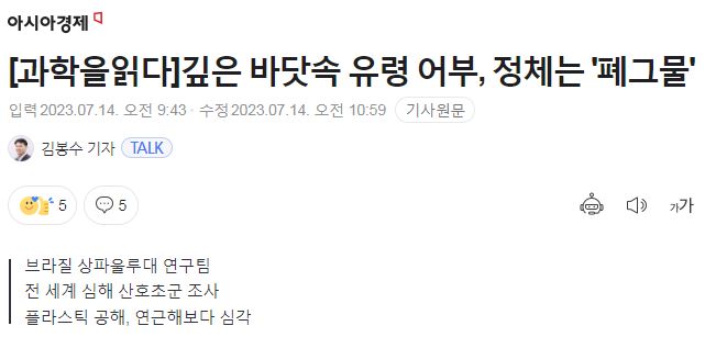 전 세계 바다의 플라스틱 오염이 심각한 가운데, 연근해보다 오히려 심해 해저가 폐어구 등에 의해 더 많이 오염돼 물고기가 죽고 산호초가 썩어가고 있는 것으로 나타났다. 브라질 상파울루대