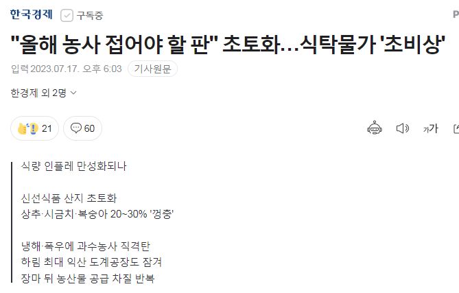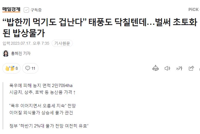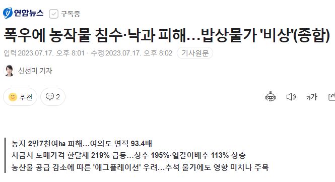 폭우에 피해 농지 면적 2만7094ha 시금치, 상추, 호박 등 농산품 가격 ↑ “폭우 이어지면서 오름세 지속” 전망 이어질 외식물가 상승세 물가 관건 정부 “하반기 2%대 물가 전망 여전히 유효” 집