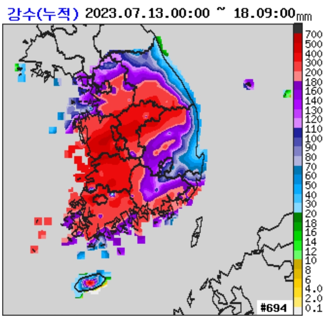 - 강원남부, 충청권, 전라권: 오늘 밤까지, 시간당 30~60mm(남해안, 지리산 부근 시간당 30~80mm)